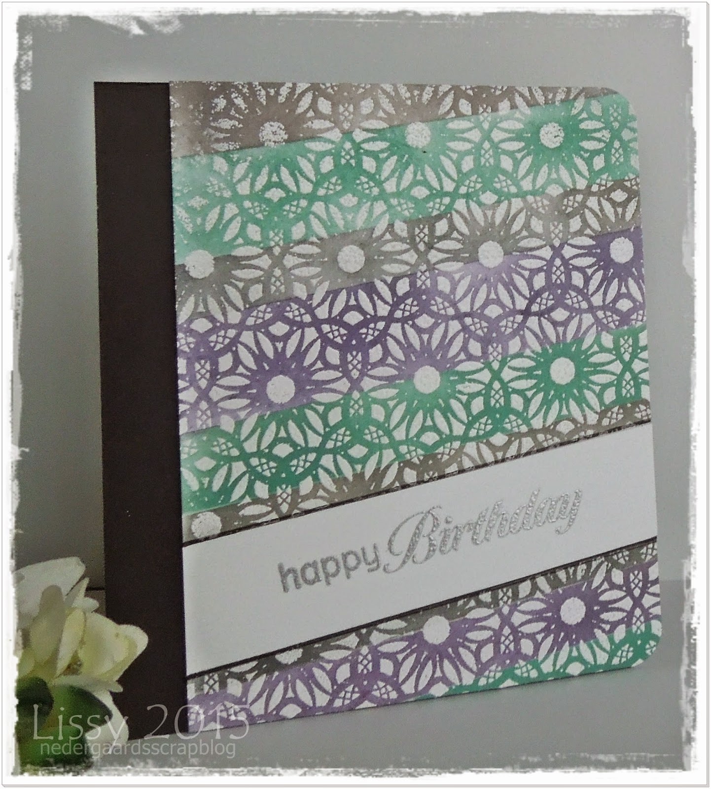 Jeg har igen deltaget i Online Card Classes :-)… her skulle man embosse baggrunden med forskellige farver Embossing Powder, men jeg har kun sort, hvid og sølv. Jeg valgte istedet at distresse i striber med distress ink og en masse stykker masking tape.